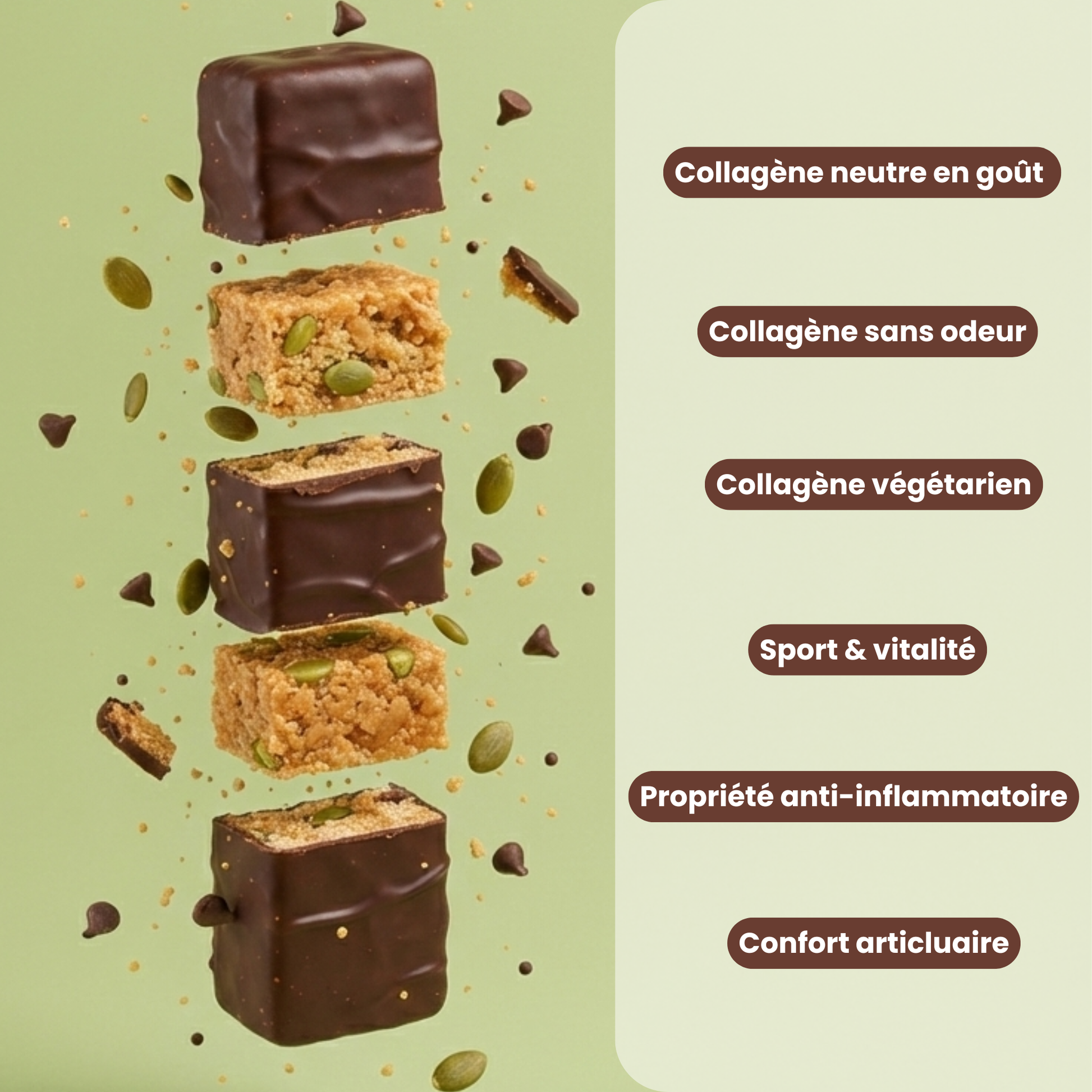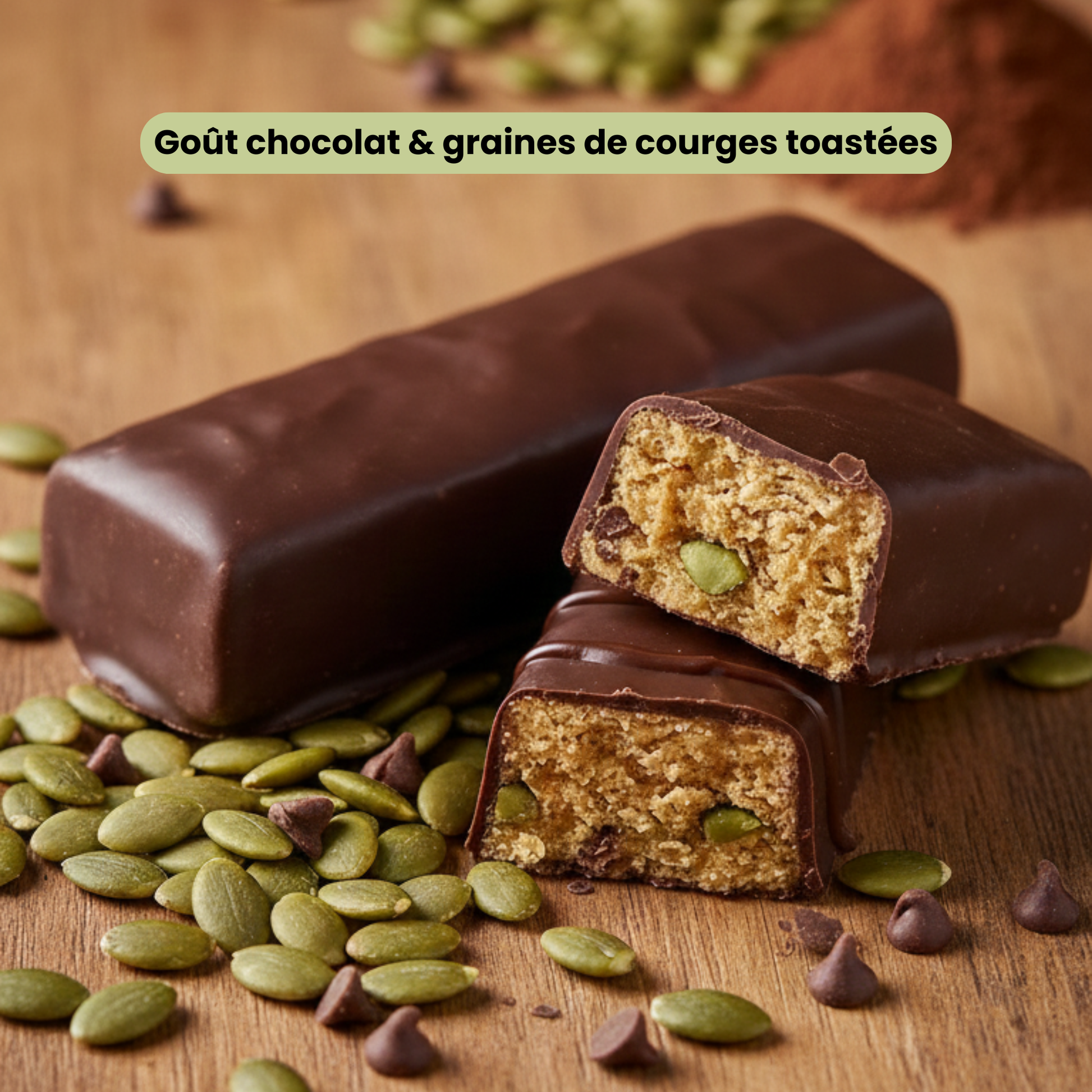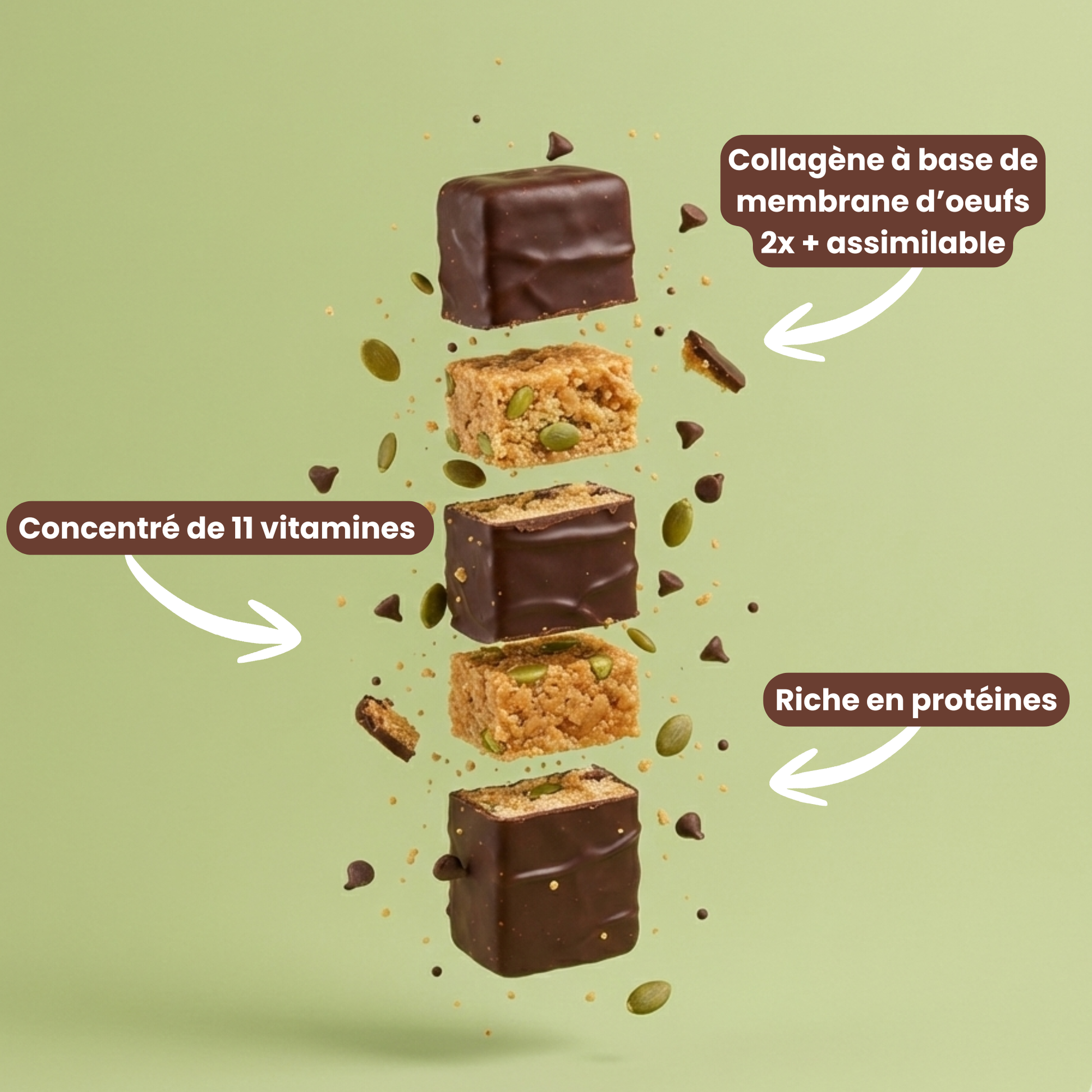 Composition : Protéines de lait, chocolat (19%) avec édulcorant (pâte de cacao, édulcorant : maltitol, beurre de cacao, émulsifiant : lécithine de soja, arôme naturel de vanille), fibres solubles de betterave, huile de tournesol, graines de courges toastées (7%), farine de graines de courge (dont sel), édulcorants : xylitol et glycosides de stéviol, protéines de pois, cacao maigre en poudre 2,5%, REGENERATE™ (0,85%) : membrane de coquille d’œuf en poudre titrée en élastine, collagène et acide hyaluronique, poudre de racine de konjac (0,35%), arôme naturel, vitamines (C, B3, E, B5, B6, B2, B1, A, B9, B12, B8). Peut contenir des traces de fruits à coques et de sésame.